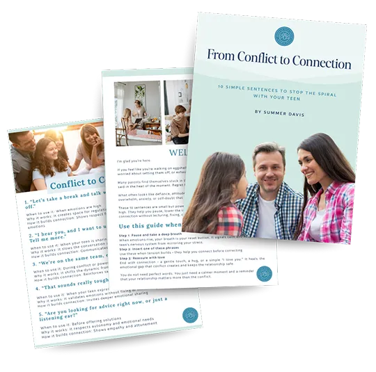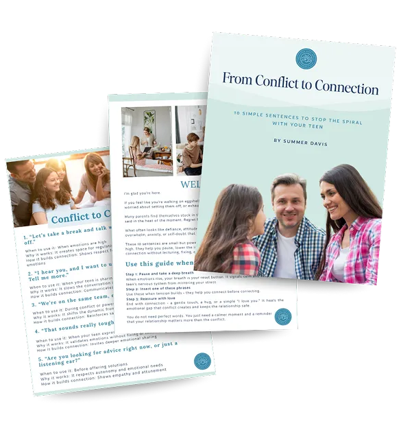 Inside, you’ll find 10 simple phrases you can use in heated moments to slow things down, lower the emotional temperature, and reconnect with your teen—without lecturing, fixing, or making things worse. These aren’t scripts to control your teen. They’re tools to help you stay calm, protect the relationship, and keep communication open when it matters most.